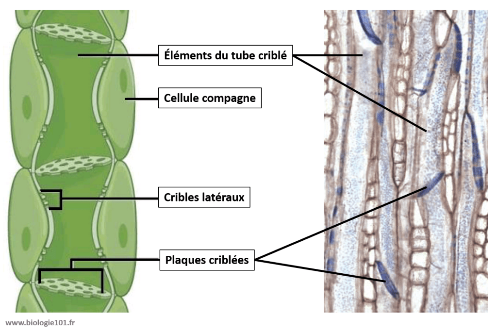 - Tubes criblés : Ce sont les principaux éléments conducteurs du phloème. Ils sont formés par un empilement de cellules appelées éléments criblés.