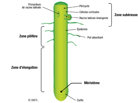 - la zone subéreuse, partie la plus âgée, où s’initie la ramification en racines secondaires ou radicelles ;