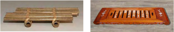 Les objets posés sur la table de bois (ou le support) recouvrent le tapis de paille de riz ou constitué de tiges inégales.
